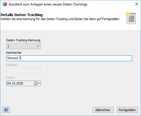 - Klicken Sie Fertigstellen, um eine neue Version zu erzeugen oder Abbrechen, um den Dialog zu verlassen, ohne ein neues Arbeitsblatt mit Daten-Tracking-Kennung zu erstellen.