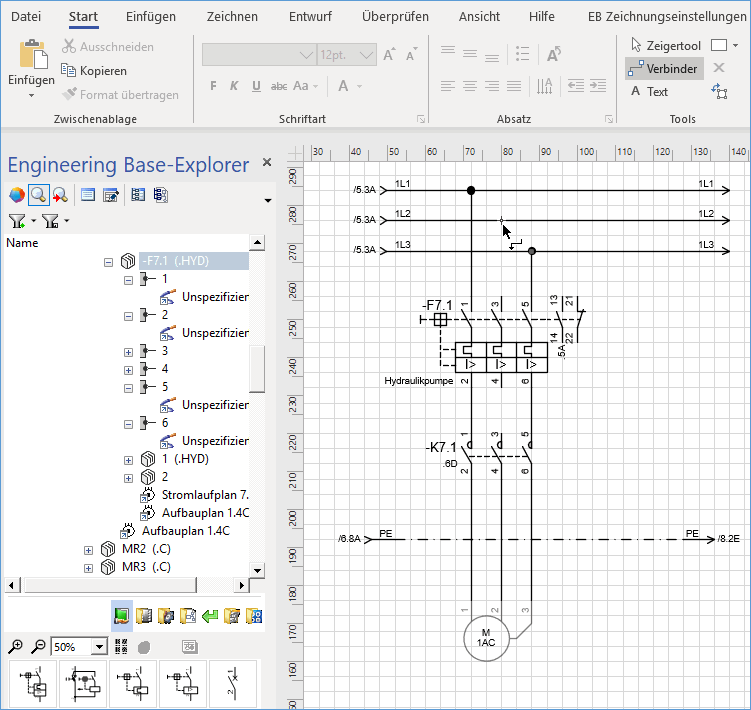 Engineering Base unterscheidet zwischen grafischen Linien und Verbindungen. Verbindungen haften automatisch an Verbindungspunkten von Shapes, brechen automatisch auf und erstellen Punkte an Kreuzungen.