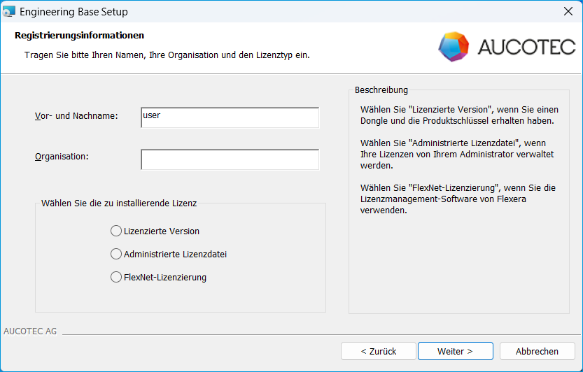 - Wählen Sie Lizenzierte Version, wenn Sie die Engineering-Base-Lizenz als Dongle mit zugehörigen Lizenznummern erhalten haben. Um diese Option zu verwenden, müssen Sie in der Folge zwingend eine Lizenzdatei einlesen oder Lizenznummern eingeben, damit die Installation fortgesetzt wird.
