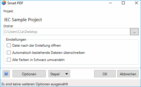 - Automatisch bestehende Dateien überschreiben: Die neu erzeugte PDF-Datei überschreibt eine zuvor erstellte PDF-Datei, wenn der Name des Projektes und der Speicherort identisch sind.