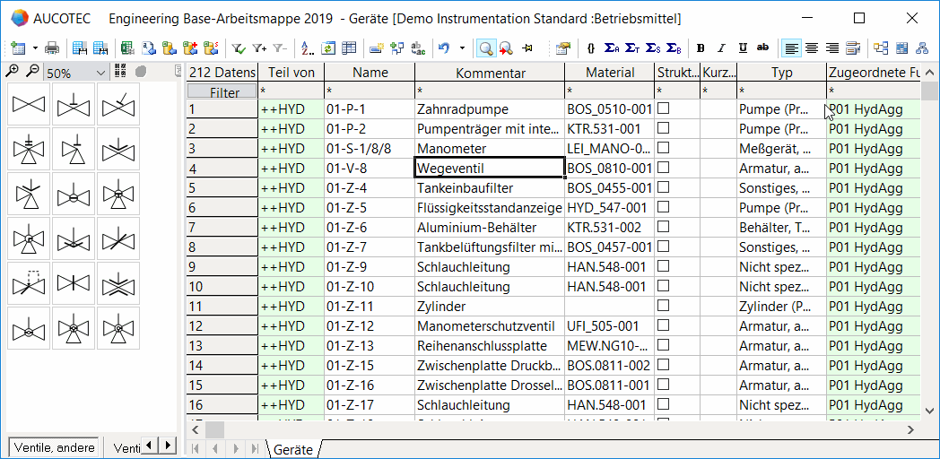 In Arbeitsblättern können Sie Daten filtern und sortieren, Eigenschaften einstellen und verändern sowie Spalten beliebig anordnen. Mit Strg + Mausrad können Sie die Inhalte der Arbeitsblätter vergrößern oder verkleinern. Da die zu bearbeitenden Informationen auch über Formelattribute erzeugt werden können, besteht die Möglichkeit, in einem Arbeitsblatt Daten unterschiedlicher Datentypen zentral zu bearbeiten. So können beispielsweise in einem Geräte-Arbeitsblatt auch korrespondierende Funktionsdaten angezeigt und modifiziert werden.