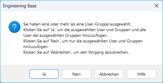 Die nachfolgende Sicherheitsabfrage wird angezeigt:Ja: Alle ausgewählten User und Gruppen inclusive aller User in der Gruppe werden zu Alle Engineering-Base-User hinzugefügt.