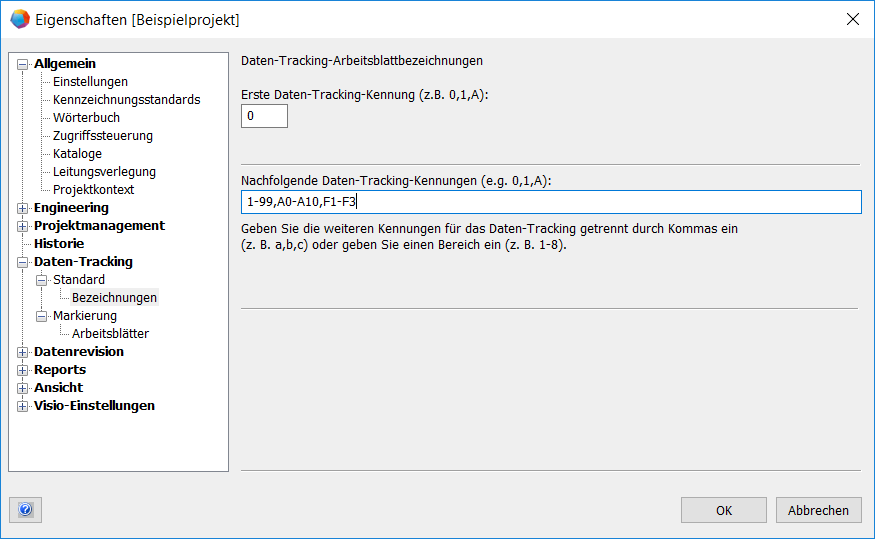- Expandieren Sie im Eigenschaften-Dialog des Projektes den Ordner Daten-Tracking und wählen Sie Standard/Bezeichnungen.
