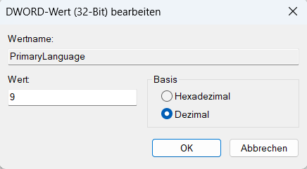 - Öffnen Sie mit einem Doppelklick auf das REG-DWORD PrimaryLanguage den Eingabedialog, ändern Sie den dezimalen Wert und klicken Sie auf OK.
