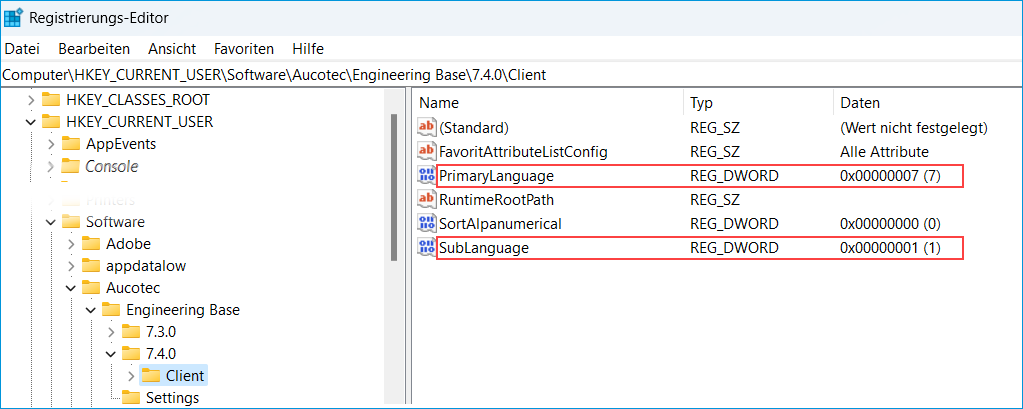 - Öffnen Sie den Registrierungs-Editor und öffnen Sie den Ordner HKEY_CURRENT_USER\Software\Aucotec\Engineering Base.