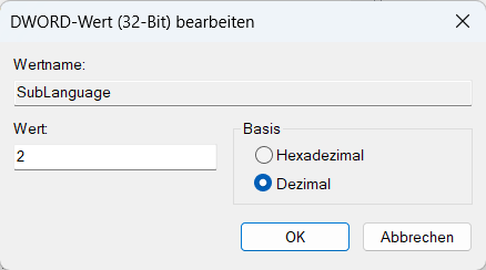 - Öffnen Sie mit einem Doppelklick auf das REG-DWORD SubLanguage den Eingabedialog, ändern Sie den dezimalen Wert und klicken Sie auf OK.