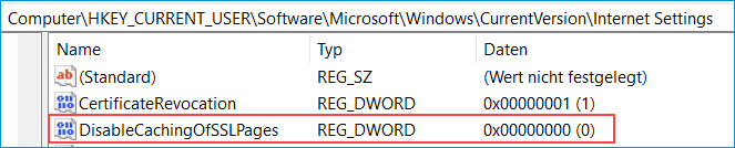 Der Wert muss auf 0 gesetzt sein.Ist dies nicht der Fall, passen Sie den dezimalen Wert von DisableCachingOfSSLPages, wie oben beschrieben, an.
