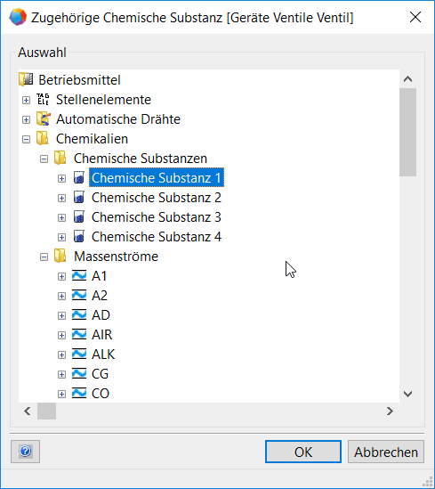 - Wählen Sie im angezeigten Dialog die chemische Substanz oder den Massenstrom aus.