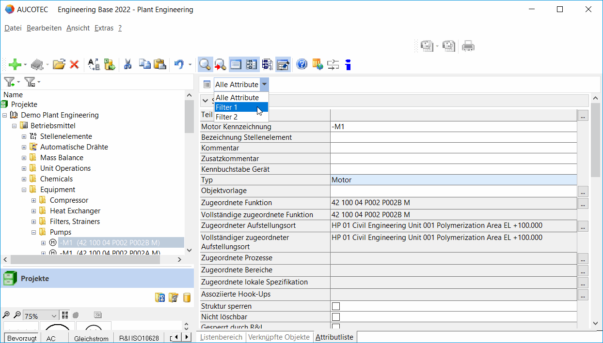 Zusätzlich zu den Ansichten Listenbereich, Verknüpfte Objekte und Verknüpfte Dokumente bietet Engineering Base Ihnen mit der Ansicht Attributliste die Möglichkeit, alle oder favorisierte Attribute des Startobjekts anzuzeigen. Dies ermöglicht Ihnen ein schnelles und effizientes Bearbeiten der Objektdaten.