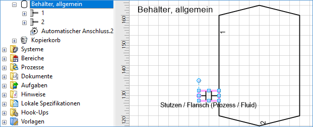 Bei der Bearbeitung von Blättern mit intelligenten Diagrammtypen können in Visio automatische Anschlüsse an einem Objekt erzeugt werden. Dies geschieht, wenn das Shape eines Stutzens oder eine Verbindung direkt auf das Shape des Objekts trifft, auch wenn am Shape an dieser Stelle kein Anschluss vorhanden ist. Der Anschluss wird, unabhängig von den vordefinierten Anschlüssen des Objekts, erzeugt. Der automatisch erzeugte Anschluss erhält den gleichen Typ wie das Netz, an dem er angeschlossen ist.