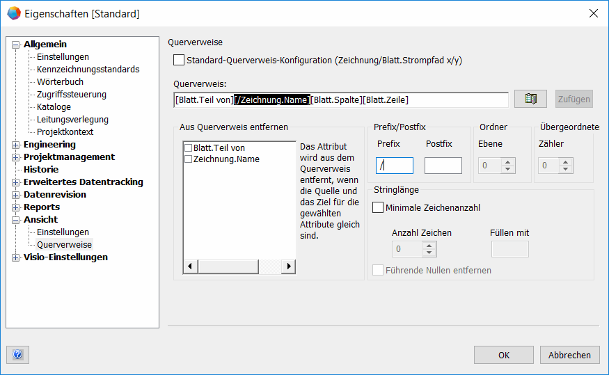 - Wenn Sie die Definition der Querverweise manuell festlegen wollen, entfernen Sie die Markierung an der Option Standard-Querverweis-Konfiguration (Zeichnung/Blatt.Strompfad x/y).