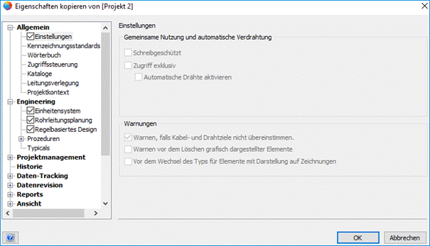 Im Dialog Eigenschaften kopieren von [Projektname] sind alle Einstellungen mit einem markiert, die Sie kopieren können.