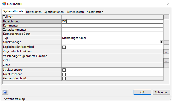 - Ein neues Kabel wird erzeugt, und der Dialog zur Eingabe von Informationen zum Kabel wird geöffnet.