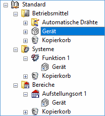 Normalerweise werden Geräte ohne Gerätebezeichnung und Eintrag im Attribut Teil von, die auf einer Funktion erzeugt werden, direkt unterhalb des Betriebsmittel-Ordners gespeichert. Wenn Sie in den Projekteigenschaften den Anlagenbau- und Instrumentierungskontext aktiviert haben, können Sie in den Datenbankeigenschaften festlegen, dass diese Geräte automatisch im Betriebsmittel-Unterordner Stellenelemente gespeichert werden.