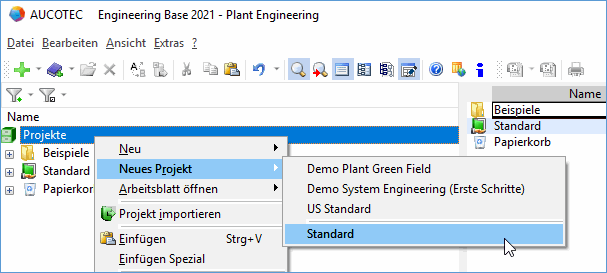 Pläne und Daten werden in Engineering Base in Projekten verwaltet. Daher müssen Sie ein Projekt anlegen, bevor Sie Pläne erstellen oder Daten eingeben können.