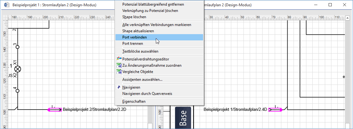 - Die neuen Querverweise werden an die zugehörigen Positionen an den Quell- und Zielsymbolen geschrieben. Beide Ports werden mit einer Potenzialgruppe assoziiert, mit dem Effekt, dass die beiden Ports auch dann in eindeutiger Weise aufeinander zeigen, wenn weitere Ports mit dem Potenzial verbunden sind. In den Eigenschaften des Shapes (Kontextmenü) wird die GUID (Globally Unique Identifier) des Querverweises im Feld Potenzialgruppe angezeigt. Die GUID setzt sich aus den individuellen Identifikationen der beiden Ports und ihren Potenzialnamen zusammen.
