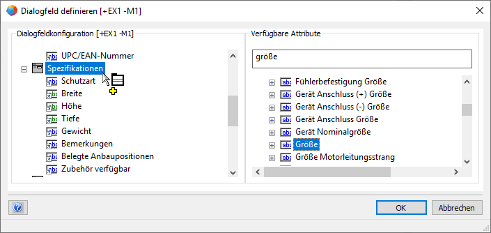 Im Beispiel wird das Attribut Größe zur Registerkarte Spezifikationen hinzugefügt.