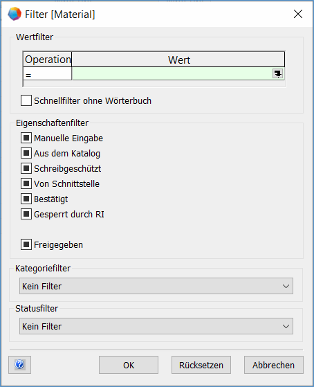 - Definieren oder wählen Sie die gewünschten Filter. Alle gewählten Filter (Werte-, Eigenschaften-, Kategorie- und Statusfilter) in diesem Dialog werden mit Und verknüpft.
