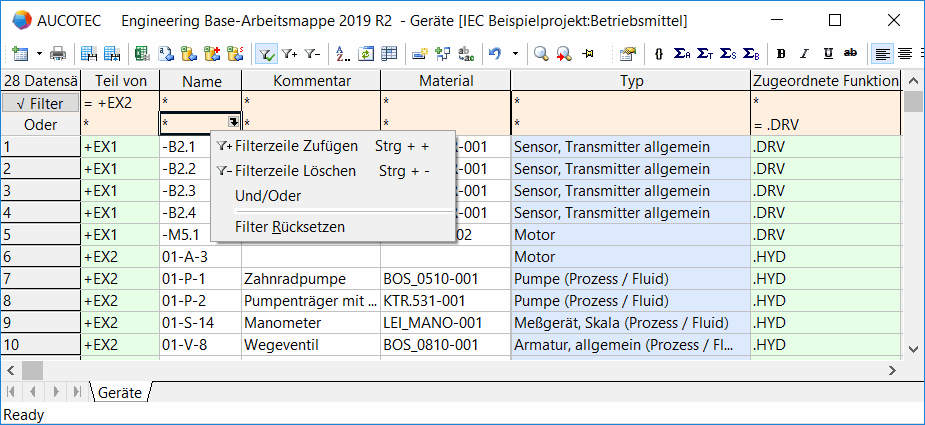 Über die Schaltfläche Filter werden alle Filterzeilen aktiviert oder deaktiviert.
