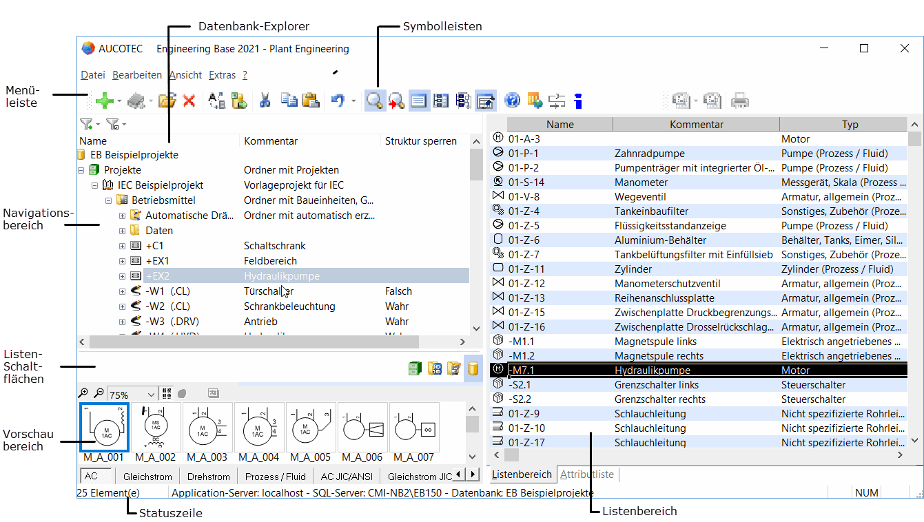 Der Explorer ist ein Tool in Engineering Base, das den Datenbankinhalt in einem Navigationsbereich und einem Listenbereich anzeigt. Die Microsoft Office ähnliche Arbeitsumgebung bietet mit ihren vertrauten Menüs und Symbolleisten eine leichte Bedienbarkeit in Engineering Base.