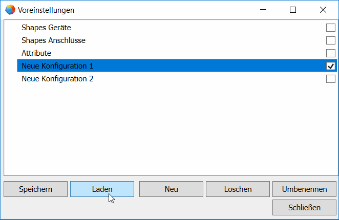- Klicken Sie Voreinstellungen, um im folgenden Dialog die aktuelle Konfiguration zu speichern oder eine bestehende Konfiguration zu laden.