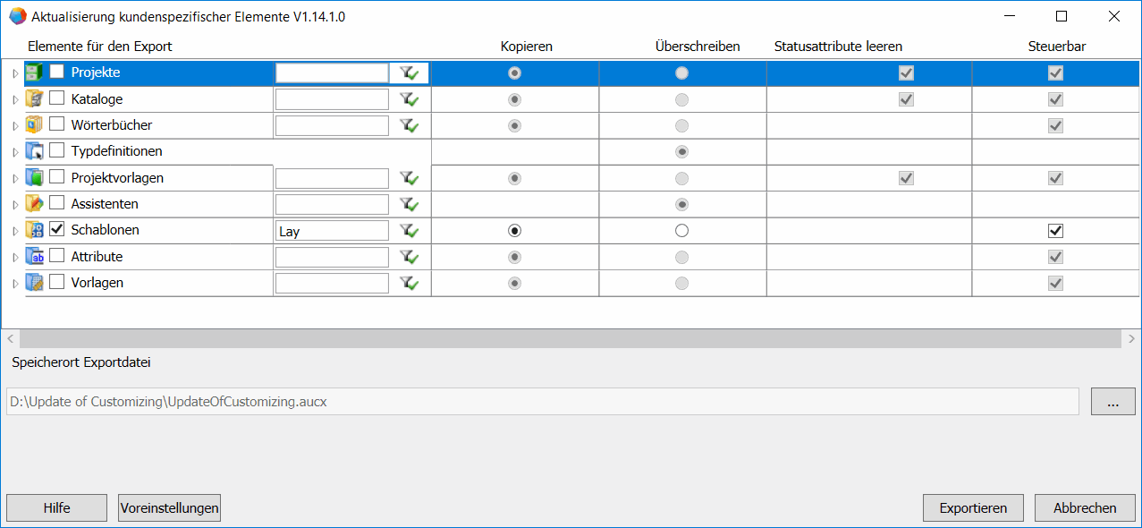 - Wählen Sie im Dialog Aktualisierung kundenspezifischer Elemente die Elemente für den Export mit den gewünschten Einstellungen aus.