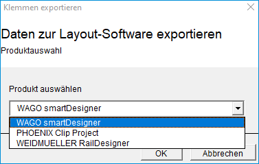 Mit dem Assistenten Export Klemmen können Sie die Daten von Klemmleisten im XML-Format für die weitere Bearbeitung an die folgenden Konfiguratoren ausgeben: WAGO smartDesigner, PHOENIX CONTACT CLIP PROJECT und WEIDMUELLER Configurator. Mit den von den Konfiguratoren bearbeiteten Daten, können Sie wiederum die Daten in Engineering Base aktualisieren.