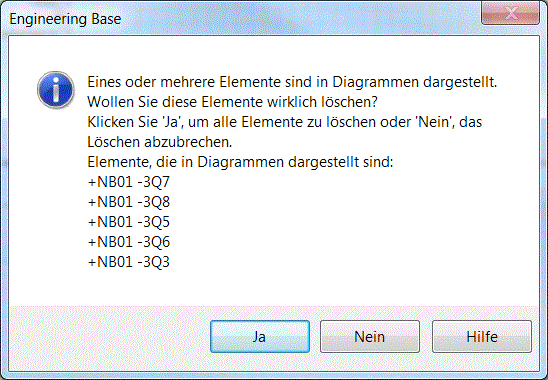 - Sowohl die selektierten Funktionen als auch die verknüpften Geräte, Baueinheiten, Kabel und Drähte werden gelöscht, wenn für keines der ausgewählten oder verknüpften Objekte die Struktur gesperrt ist. Wenn mindestens eines der zugehörigen Objekte gesperrt ist, dann wird dies durch eine Fehlermeldung mitgeteilt und der Löschvorgang wird abgebrochen. Wenn mindestens ein Element in (anderen) Diagrammen dargestellt wird, dann wird der nachfolgende Dialog geöffnet: