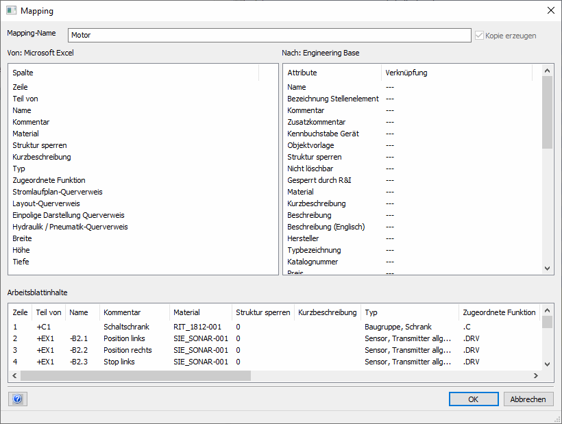 Der Datenimport aus Excel erfordert eine Zuordnung von Excel-Spalten zu Engineering-Base-Attributen.