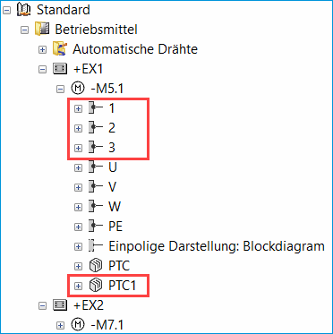 Ein Projekt hat zwei Baueinheiten mit jeweils einem Motor +EX1 -M5.1 und +EX2 -M5.1x mit unterschiedlichen Anschlüssen.