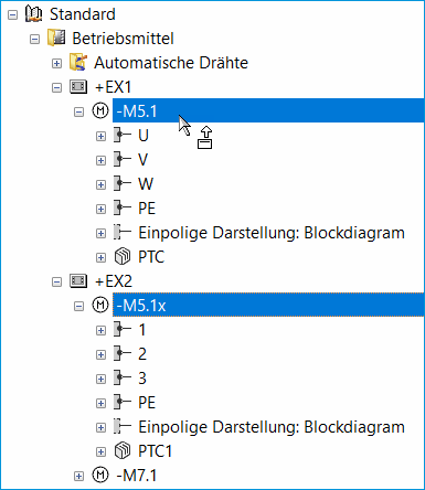 Nach dem Verschieben und Zusammenführen von +EX2 -M5.1x auf +EX1 -M5.1, hat +EX1 -M5.1 auch die Anschlüsse von +EX2 -M5.1x. Da bei den Anschlüssen PE und Einpolige Darstellung:Blockdiagram die Merge-Referenzen im Quell- und Zielobjekt übereinstimmen, werden diese Anschlüsse nicht in die Struktur von +EX1 -M5.1 übernommen.