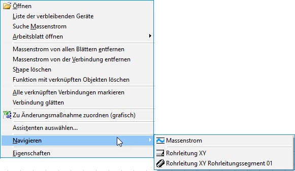 - Im Kontextmenü werden Ihnen unter Navigieren alle zu der Verbindung zugeordneten Massenströme, Rohrleitungssegmente und Rohrleitungen angezeigt.