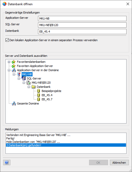 - Wählen Sie unter Server und Datenbank auswählen den Application-Server, den SQL-Server und die Datenbank, die Sie verwenden wollen.