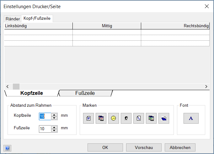 - Definieren Sie Kopf- und Fußzeilen mit Text, Marken und Formatierung.