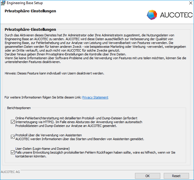 Die Privatsphäre-Einstellungen sind standardmäßig deaktiviert. Erst nachdem Sie eine oder mehrere Optionen aktiviert haben, werden Informationen zwecks Fehlermonitoring und -behebung an AUCOTEC gesendet.
