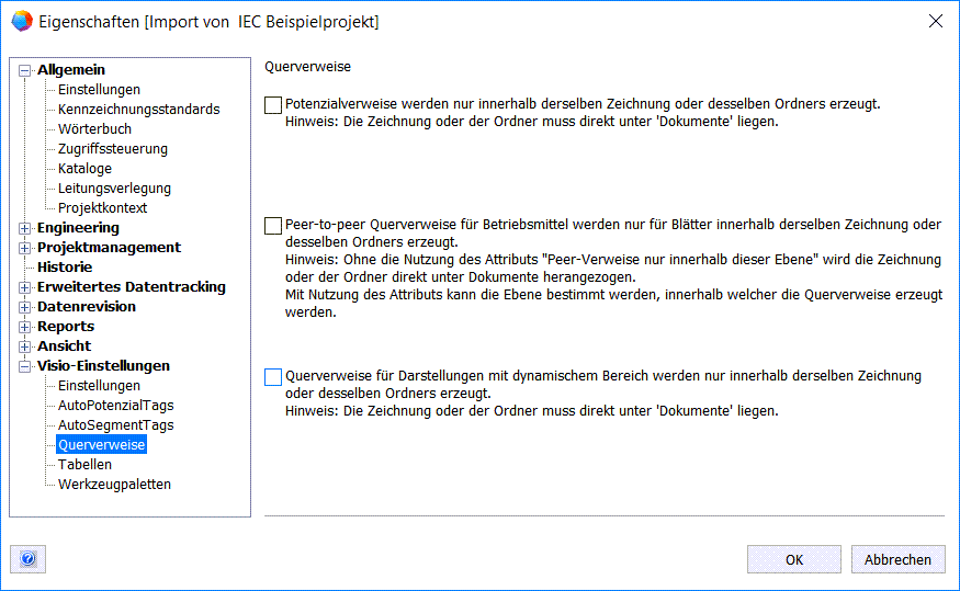 - Selektieren Sie im Dialog Eigenschaften des Projektes den Knoten Visio-Einstellungen/Querverweise.