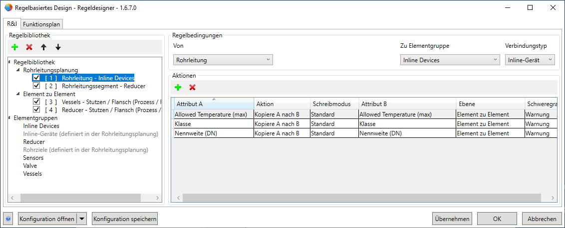 Definition von Aktionen, die durchgeführt werden sollen, wenn die festgelegten Bedingungen für zwei verbundene Elemente erfüllt sind. Für die Rohrleitungsplanung kann festgelegt werden, welche Aktionen für die verschiedenen Inline-Geräte einer Rohrleitung ausgeführt werden sollen.
