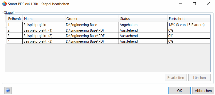 Mit der Stapelverarbeitung des Assistenten Smart PDF kann die Konvertierung von Projekten in PDF-Dateien zu einem späteren Zeitpunkt gestartet werden.
