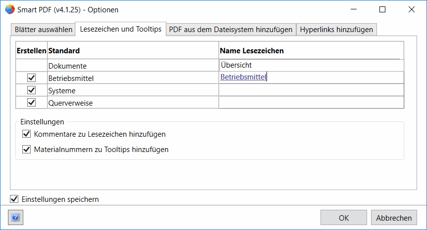 Die aufgeführten Systemordner unter Standard werden als Lesezeichen im PDF-Navigationsbereich verwendet. Sie können den Systemordnern unter Name Lesezeichen einen anderen Namen zuordnen, der dann im PDF angezeigt wird.