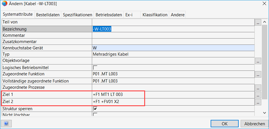 - Die Kabelziele in den Attributen Ziel 1 und Ziel 2 im Ändern-Dialog des Kabels werden getauscht.