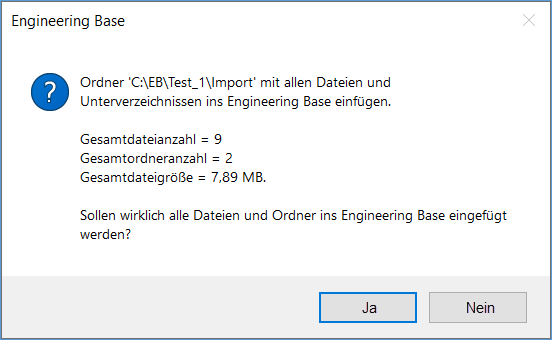 - Wenn Ihr Import mindestens ein Verzeichnis enthält, dann wird der Dialog Engineering Base geöffnet. Bestätigen Sie den Dialog mit Ja, wenn Sie den Import durchführen wollen oder mit Nein, um diesen abzubrechen.