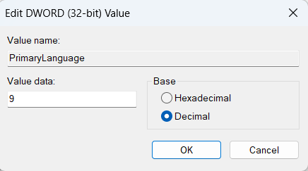 - Double-click the REG-DWORD PrimaryLanguage to open the entry dialog, change the decimal value and click OK.