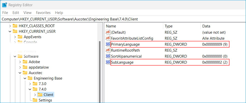 - Open the Registry Editor and open the folder HKEY_CURRENT_USER\Software\Aucotec\Engineering Base.
