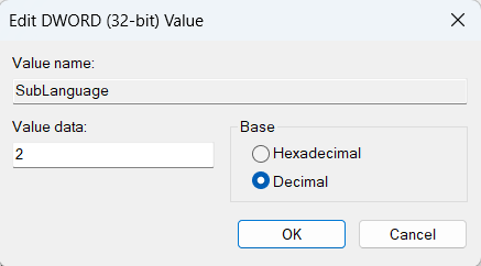 - Double-click the REG-DWORD SubLanguage to open the entry dialog, change the decimal value and click OK.