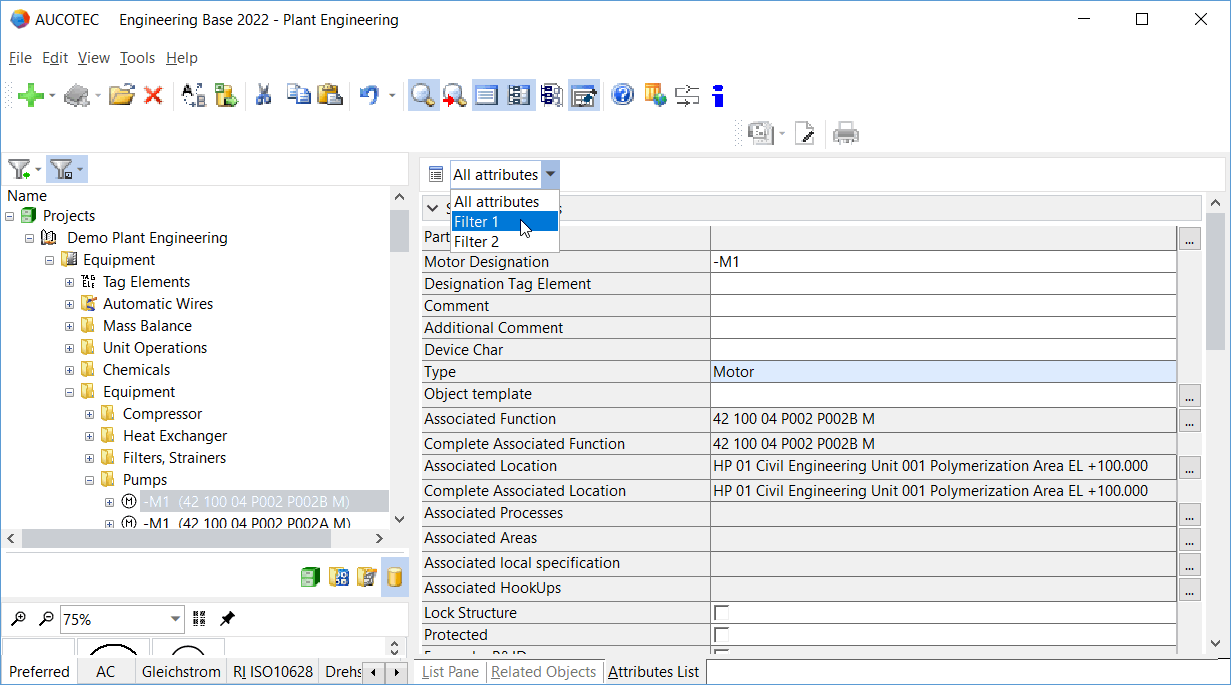 In addition to the views List Pane, Related Objects and Related Documents, Engineering Base offers the possibility to display all attributes or your favorite attributes of the start object by means of the Attributes List view. This enables you to edit object data quickly and efficiently.