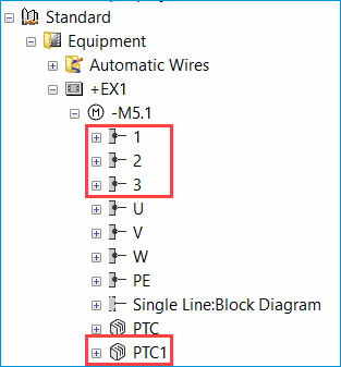 As the merge references in the source and destination objects match for the PE and Single Line:Block Diagram pins, these pins are not copied into the structure of +EX1 -M5.1.