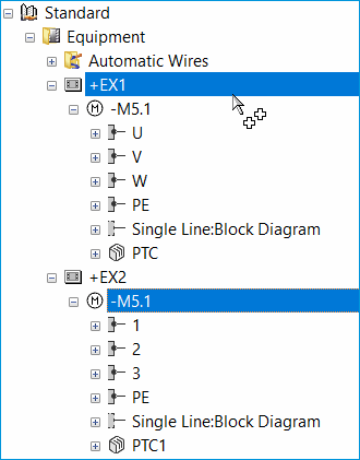 A project has two units +EX1 and +EX2. Both units contain a motor -M5.1 with different pins.