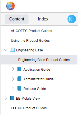 Display and hide the navigation pane. If you are working with a low display resolution, for instance because you are working with a mobile device, you can temporarily hide the navigation pane on the left side of the Engineering Base Help to get the maximum possible display space for the help content. To do so, click the button on the upper left. To be able to use the navigation pane again, click the button. |