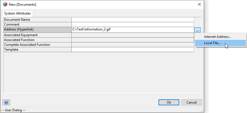 Enter the address of the hyperlink directly into the Address (Hyperlink) attribute or use the button: - to open your internet browser via the field Internet Address. You can then copy the requested internet address to the Address (Hyperlink) attribute.