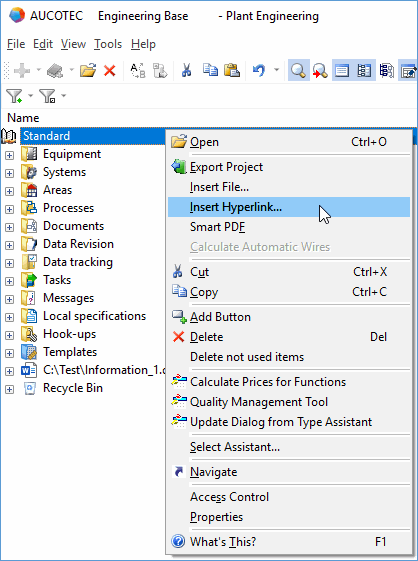 In Engineering Base, you can link additional information that you do not want to store in Engineering Base with a project, equipment and functions.